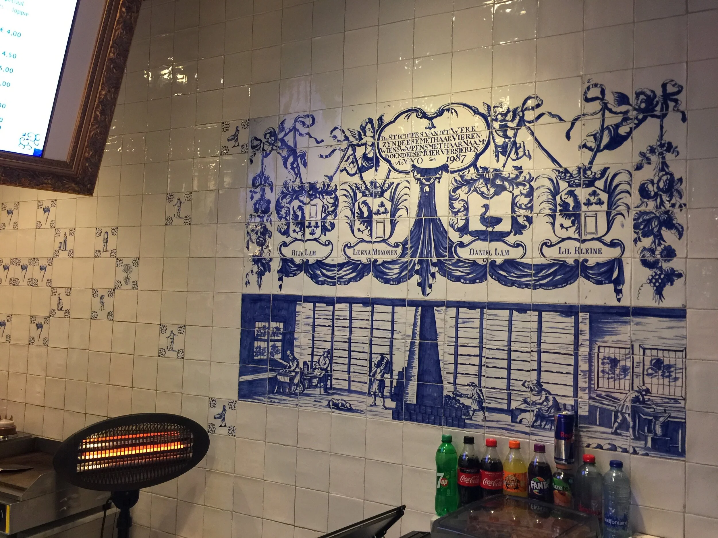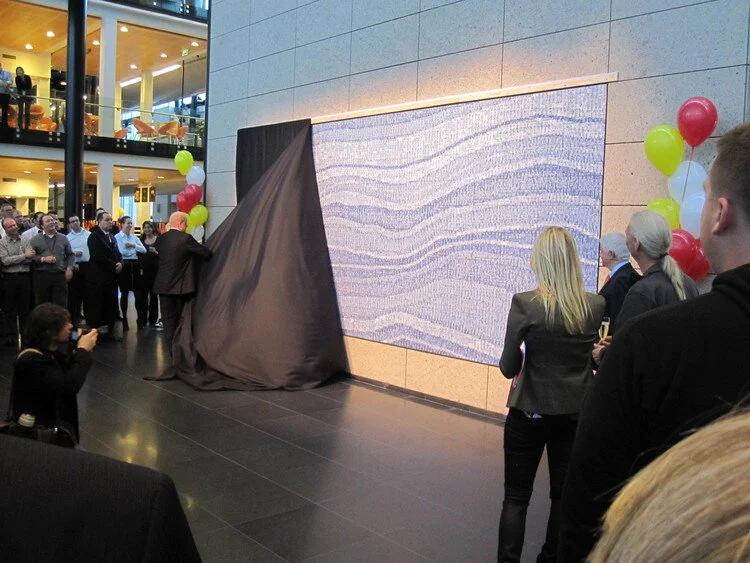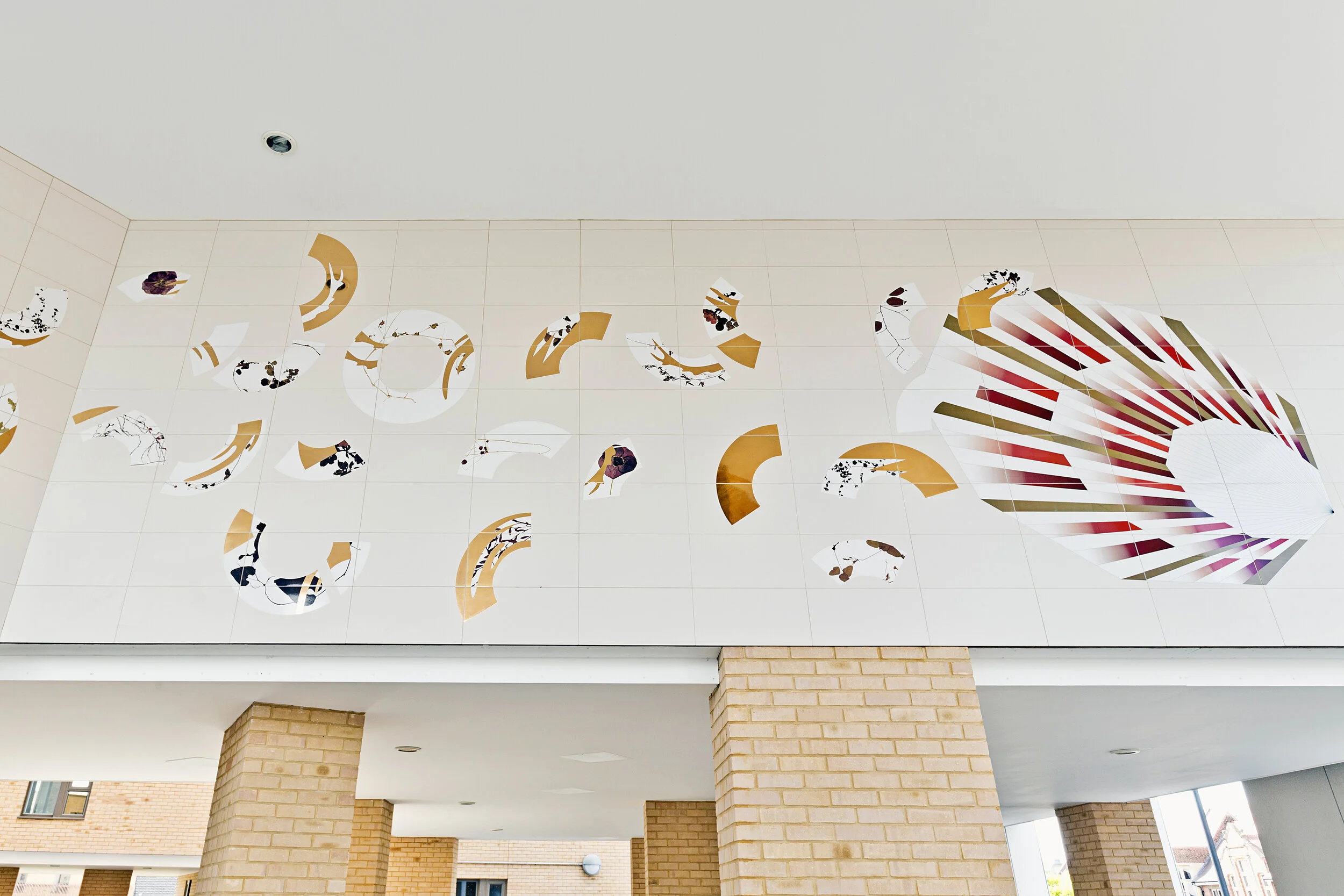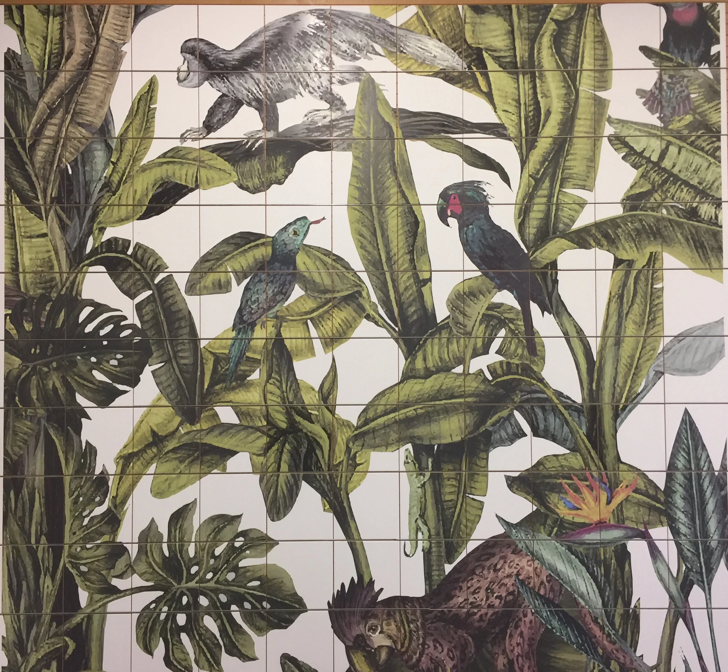 Entrance hall tile panel designed by Steven Schuurman. He photographs buildings, children, flowers and landscapes. He creates digital 3D fractals and objects . He combines these image elementsinto colorful dreamlike landscapes.