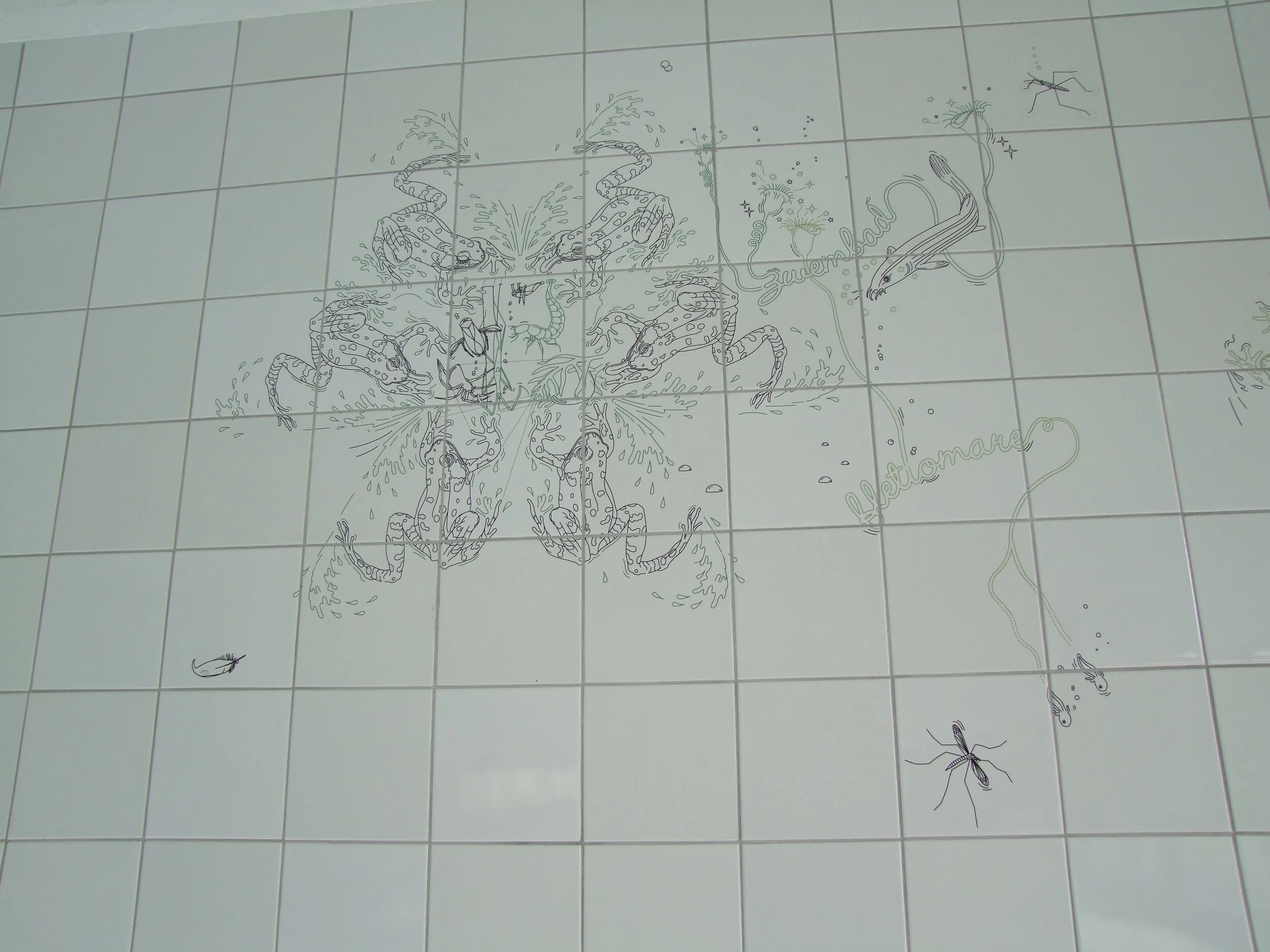 In the Fletiomare swimming pool in De Meern, the walls are decorated with images of frogs, insects, birds and landscapes. With super sharp vector drawings, the graphic artist Harmen Liemburg has created a fantastic world of frogs and birds that experience all kinds of adventures on the tile walls of the pool. The drawings are burned on a mix of matte, satin and glossy tiles measuring 20 x 20 cm. For the users of the pool, there is always something funny to discover in the 30 m2 images on the tiles.