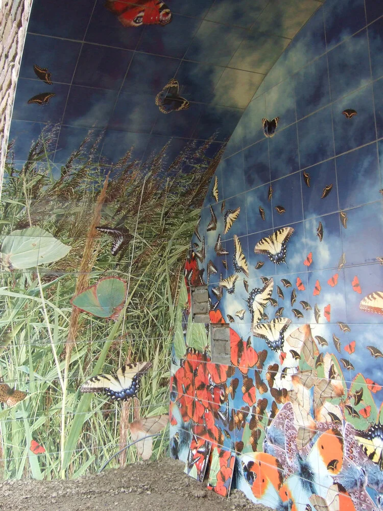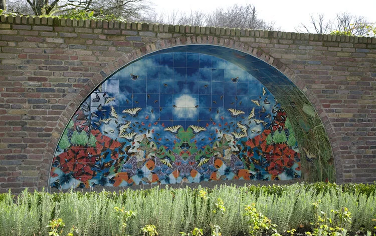 Garden tiles. For two bay windows in a garden in the Bilt, artist Jackie Sleper has designed two fantastically beautiful tile panels. One tableau features hundreds of colorful butterflies, the other shows dozens of birds looking into the space with an open mind. The bay windows have a diameter of 4 m and a height of 2 m, the depth is 1 m in total approx. 25 m2.